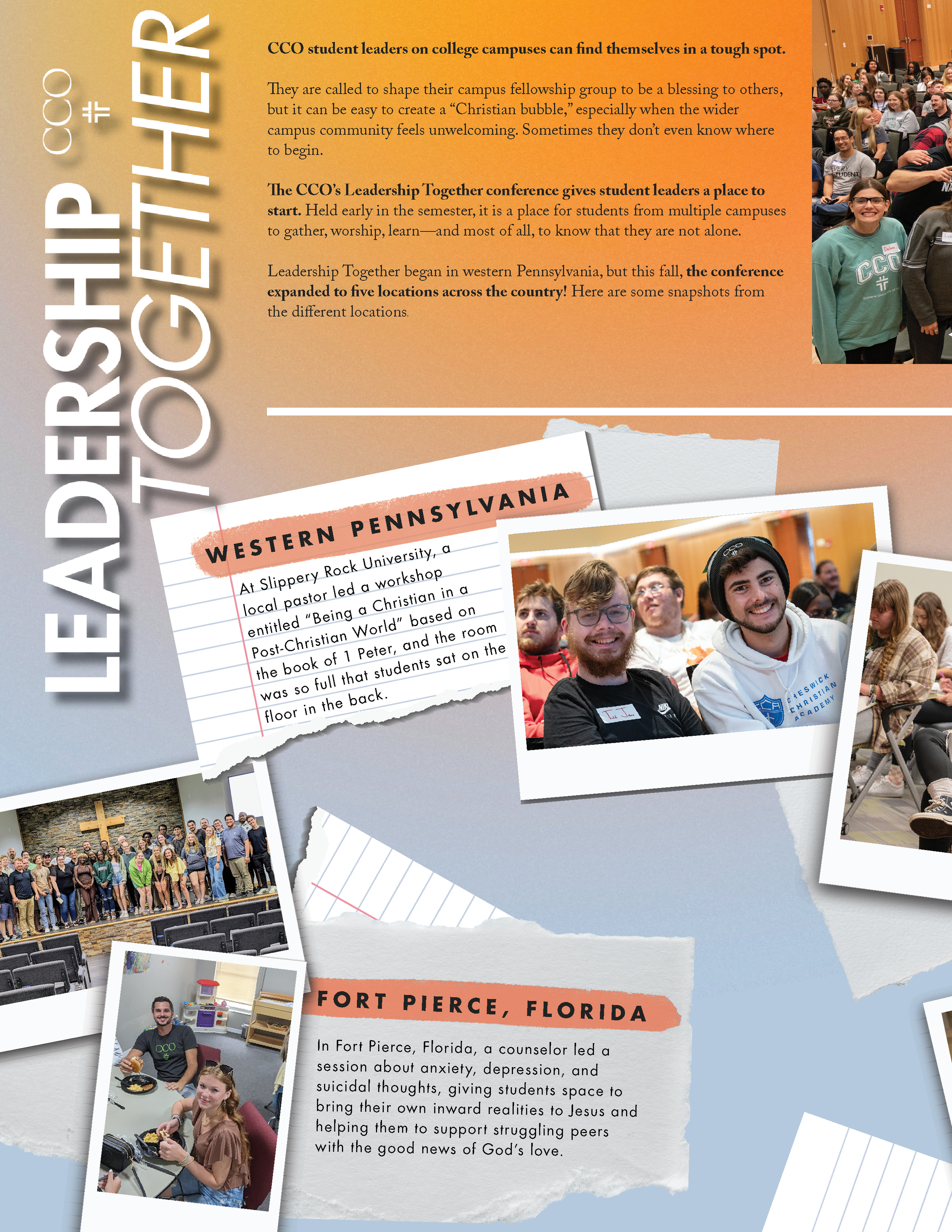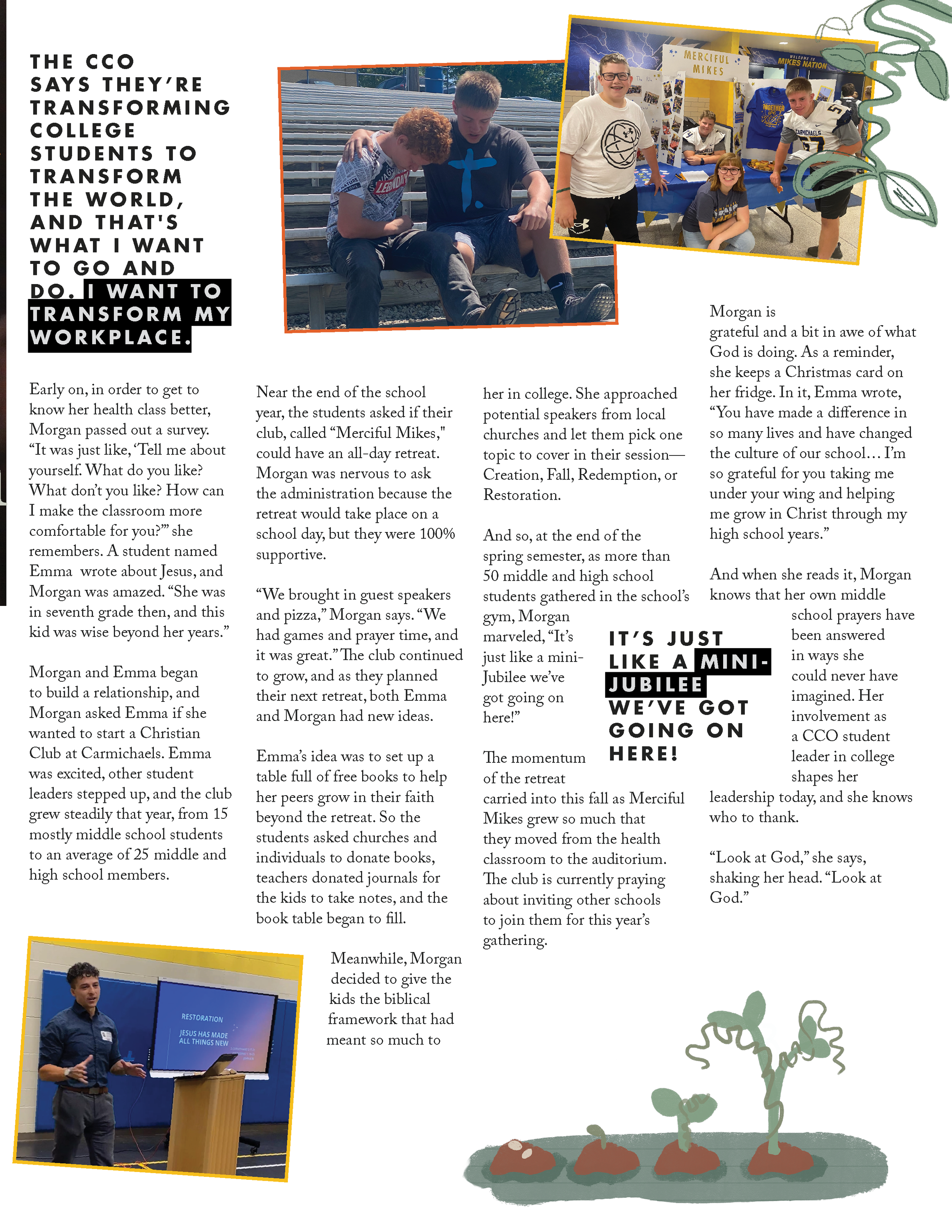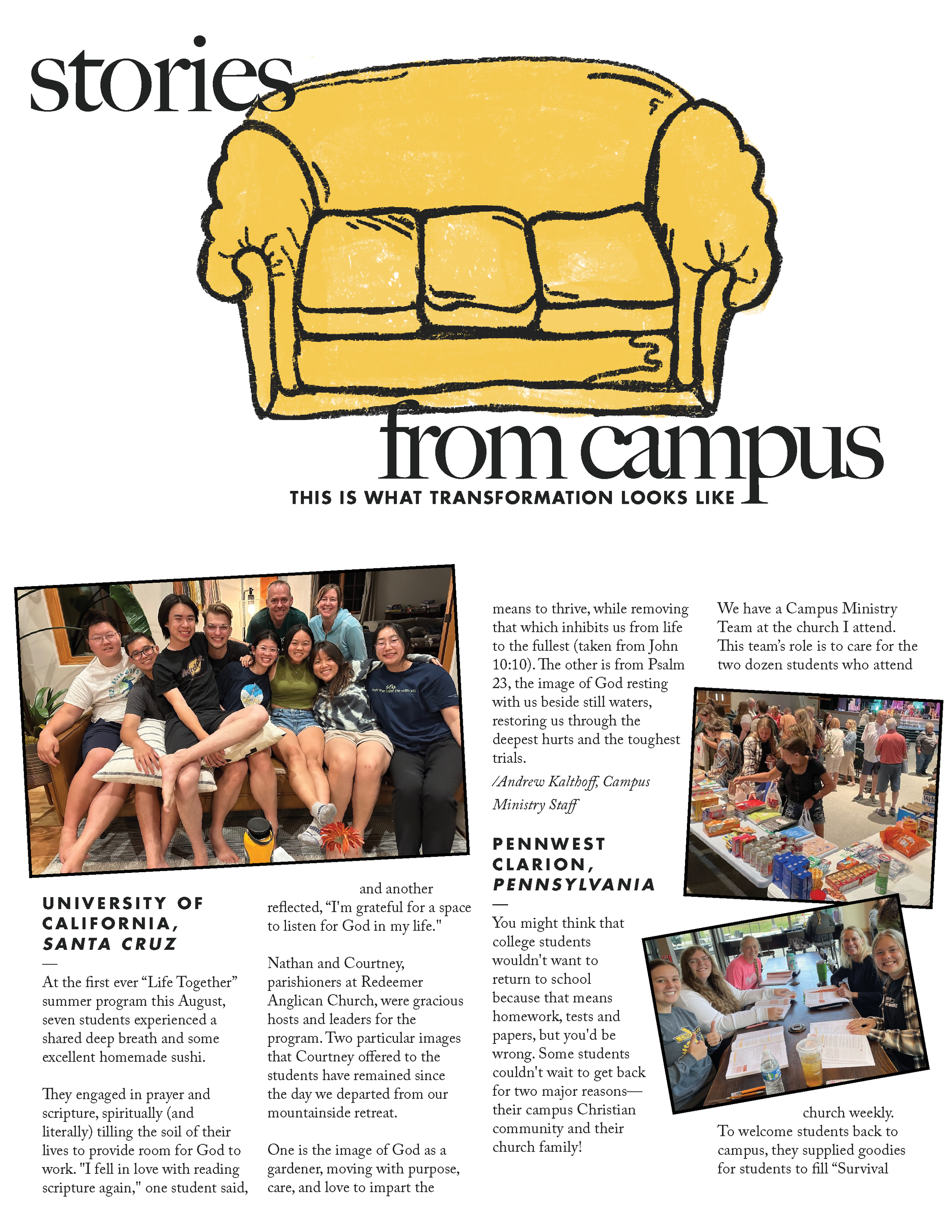 This magazine was designed with the donor in mind, telling the stories of students on campus encountering Jesus and experiencing life change. The design approach was intentionally student forward, reflecting a young, fresh aesthetic that resonates with the energy of campus life, while still maintaining a level of clarity and polish that speaks to donors. The goal was to visually capture the vibrancy of student ministry while helping supporters clearly see the impact of their investment.